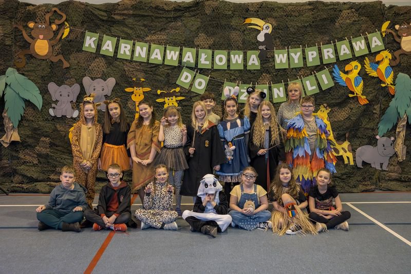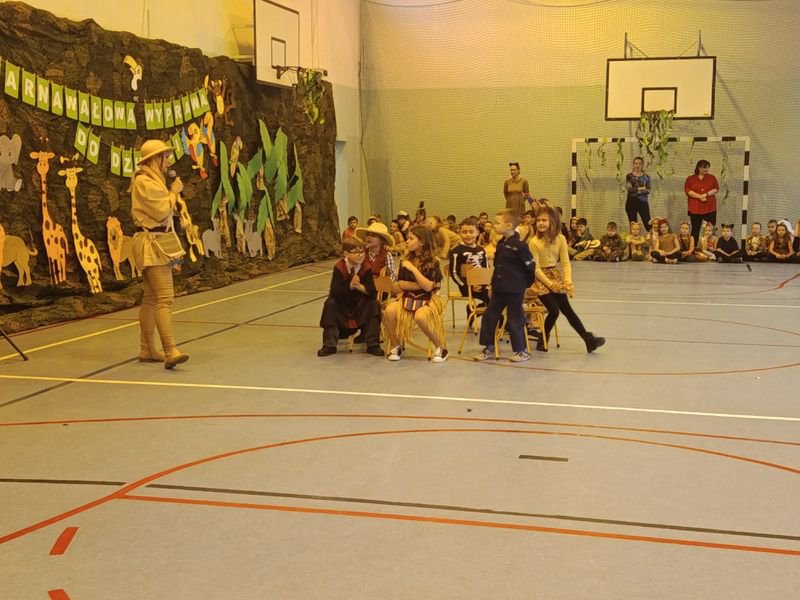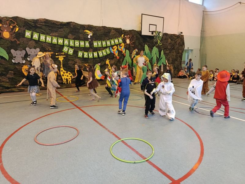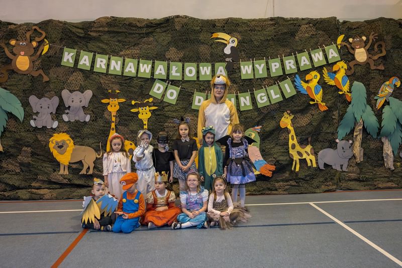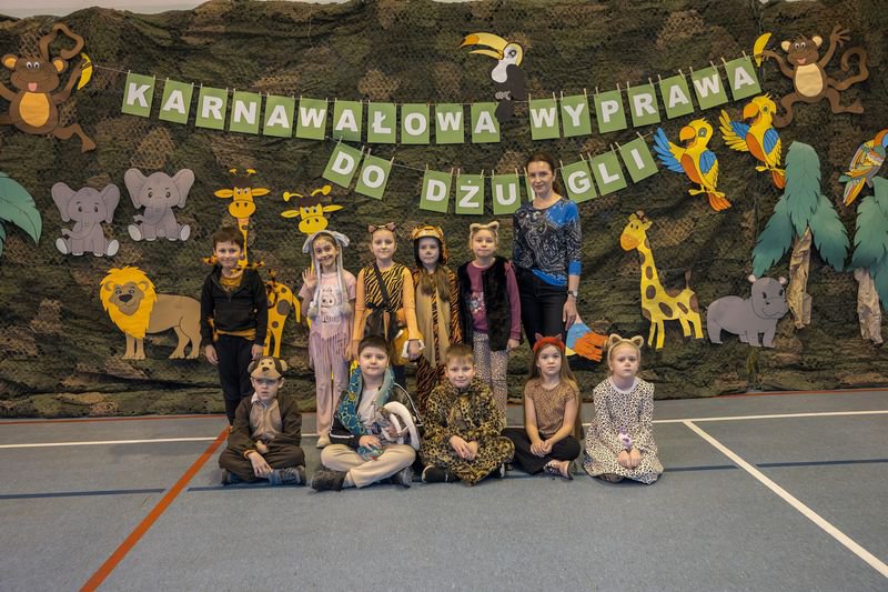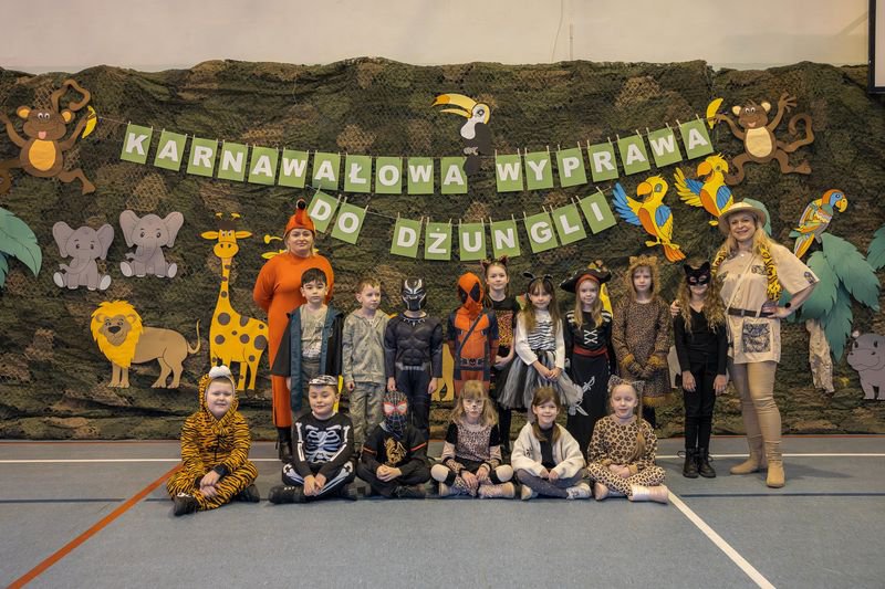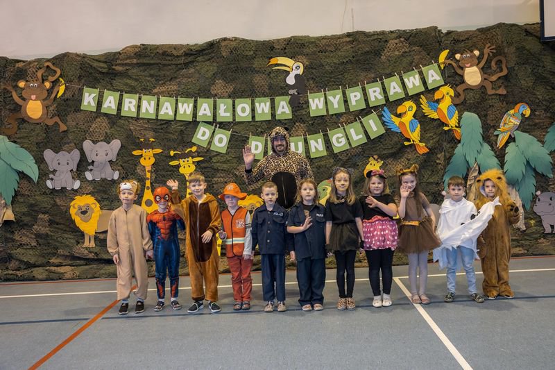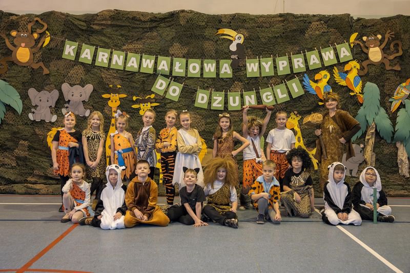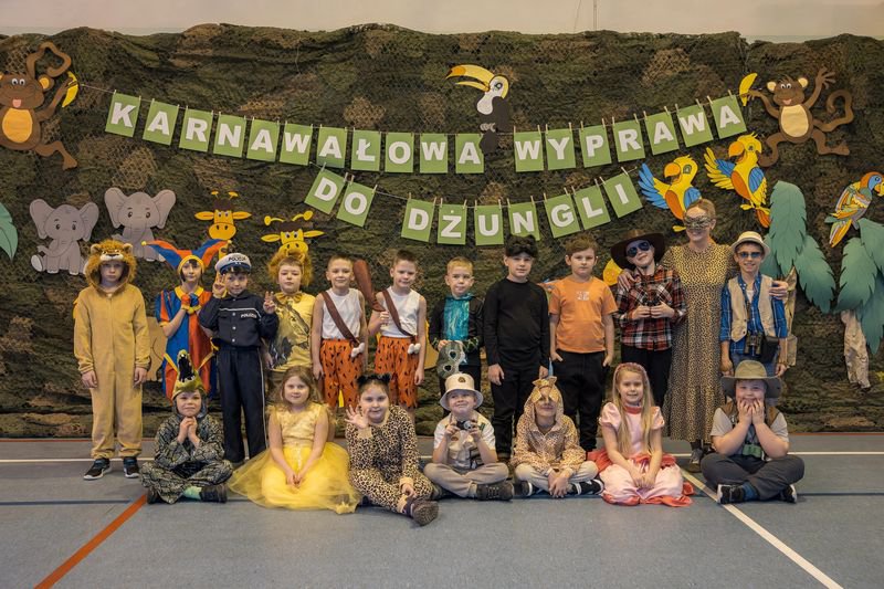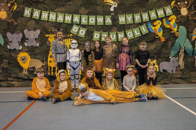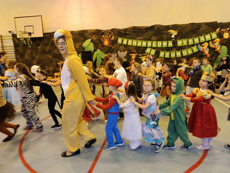 Projekt tegorocznej zabawy karnawałowej pod hasłem „Karnawałowa wyprawa do dżungli” przeniosła dzieci z oddziałów przedszkolnych oraz klas I - III w sam środek egzotycznej przygody.