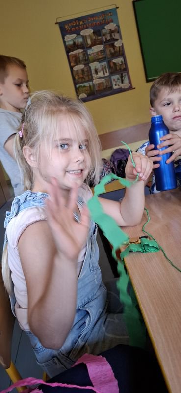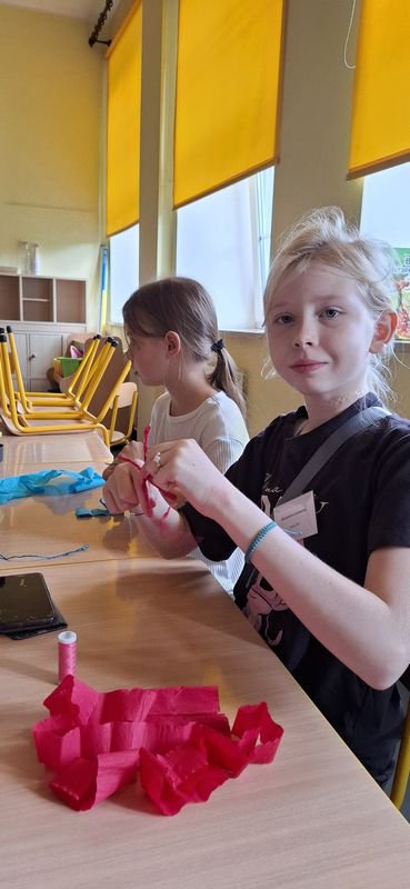 Aleksandra z klasy 3 poprowadziła wyjątkowe warsztaty, podczas których uczestnicy tworzyli “dzikie postacie z bibuły i nici”.
