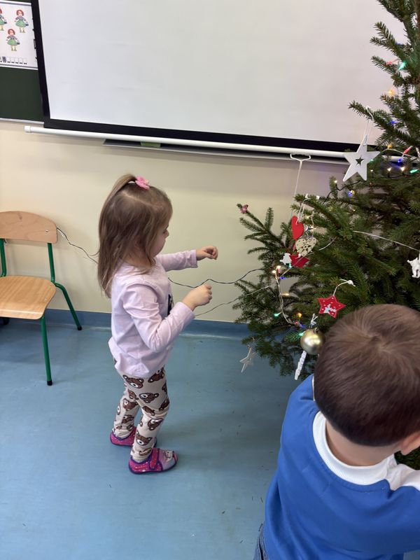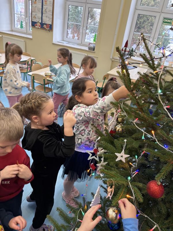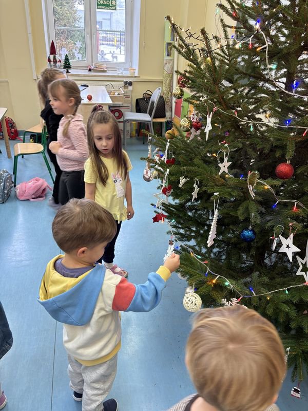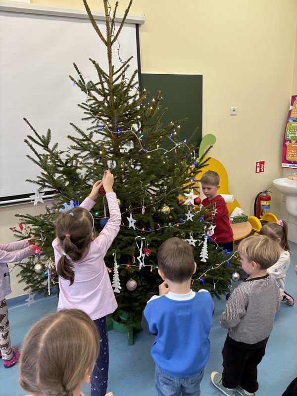 W oddziałach przedszkolnych czuć już prawdziwą, świąteczną atmosferę! Dzieci z wielkim zaangażowaniem uczestniczyły w ubieraniu zielonego drzewka, które stało się piękną tradycją i wyjątkowym momentem przygotowań do nadchodzących świąt.
