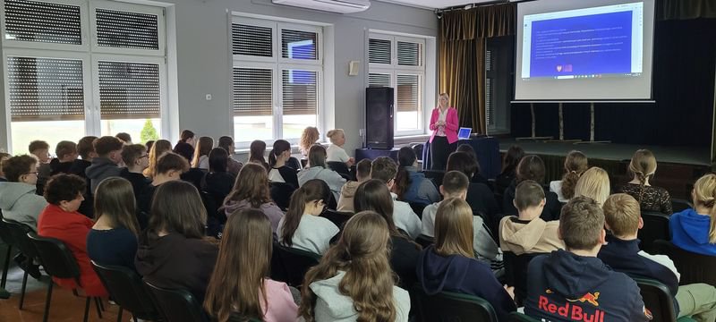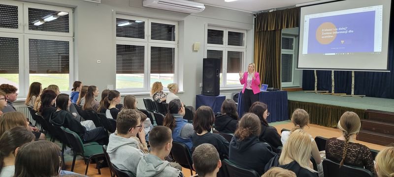 „8 klasa i co dalej? Zestaw informacji dla ucznia” – to tytuł spotkania, które odbyło się 13 kwietnia 2026 r. z myślą o najstarszym roczniku młodzieży z naszej szkoły. Poprowadziła je Anna Koziarska - główny specjalista ds. doradztwa zawodowego w Centrum Kształcenia Rzemiosła Dualnego i Zawodowego w Koninie.