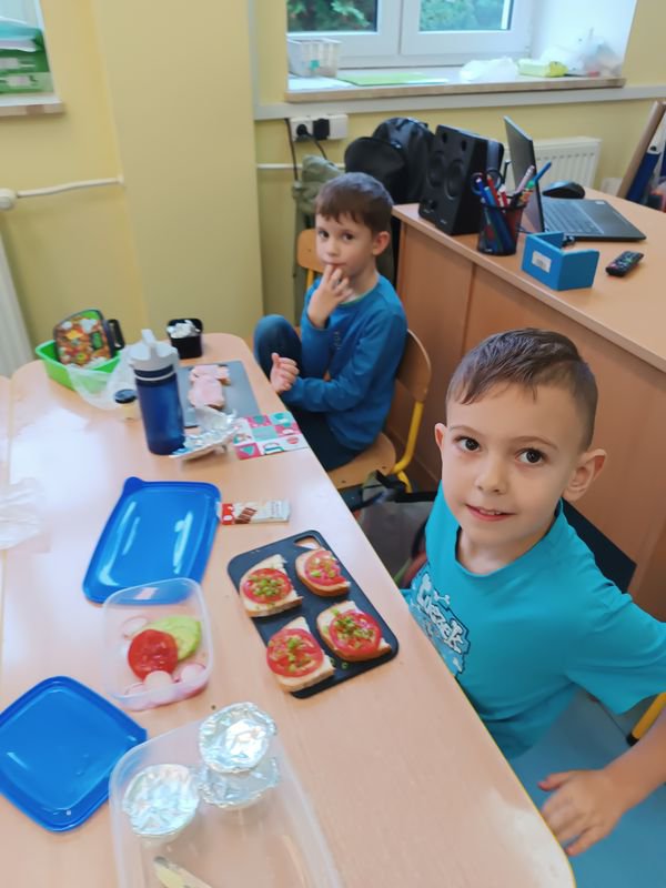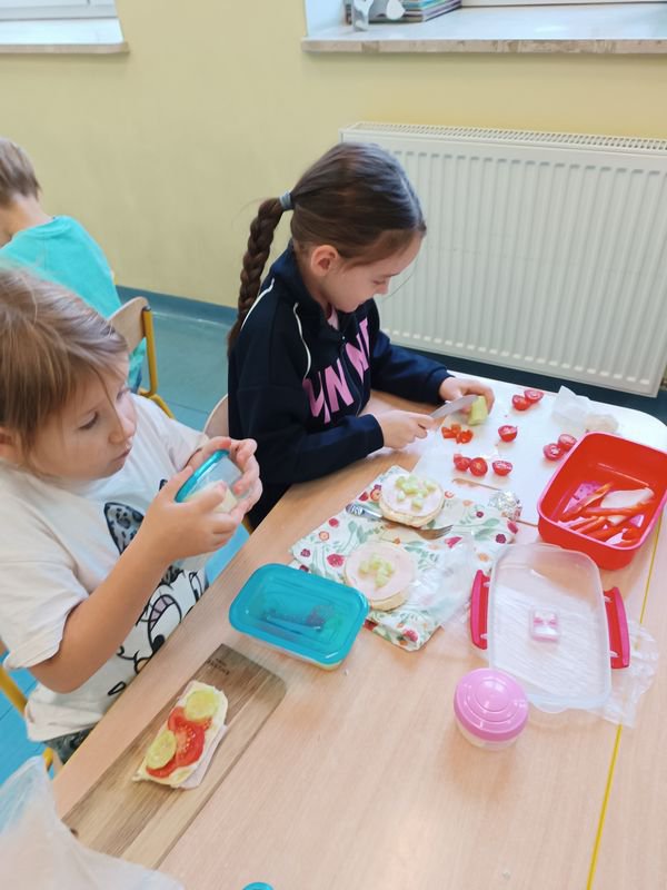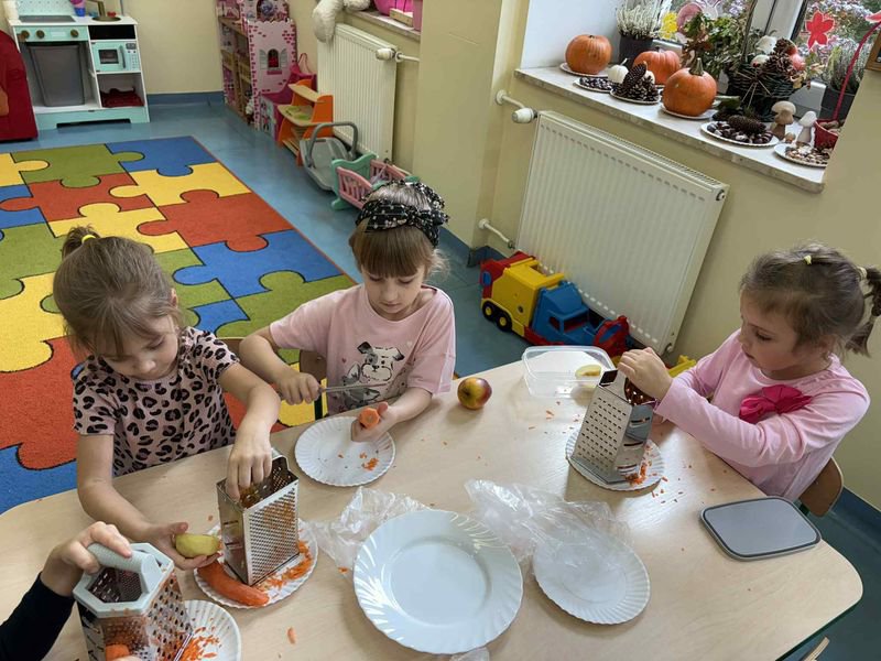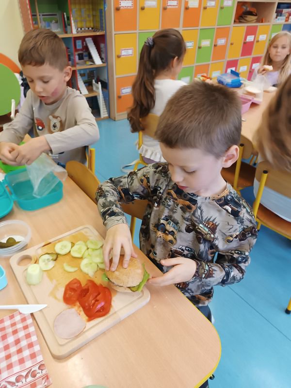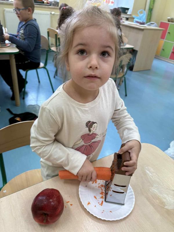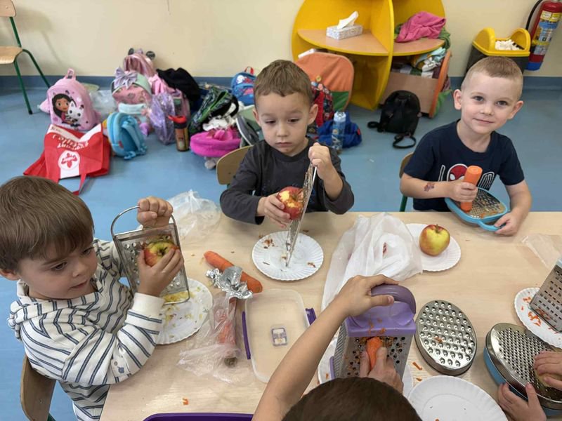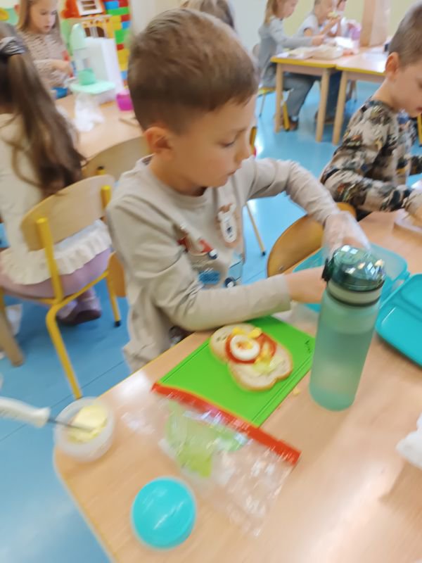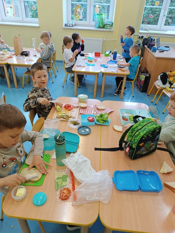 W oddziałach przedszkolnych dzieci przygotowywały pyszne potrawy. Biedroneczki dziarsko tarły i tworzyły surówki, a Motylki w skupieniu, z precyzją cięły i smarowały pyszne kanapki. Wspaniała uczta i najważniejsze - zdrowa!