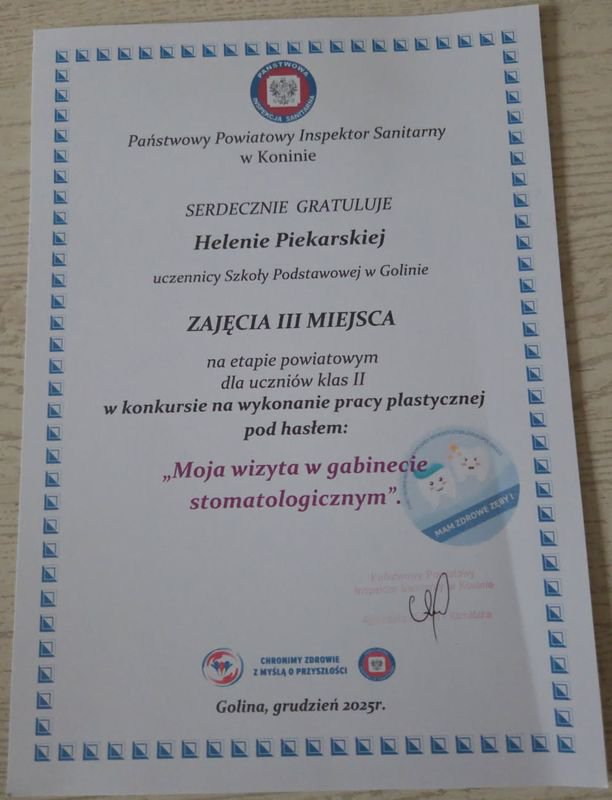 Z radością informujemy, że Helena Piekarska z klasy 2b zajęła III miejsce w powiatowym konkursie plastycznym pt. „Moja wizyta w gabinecie stomatologicznym”.