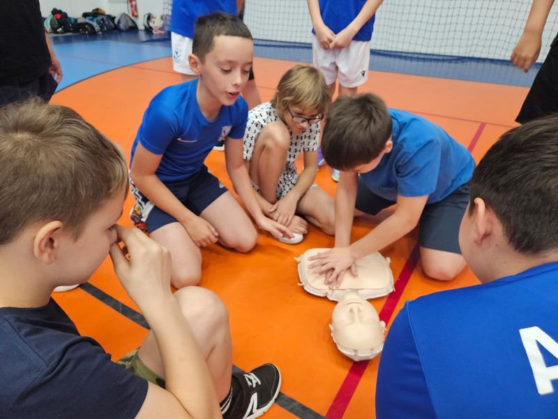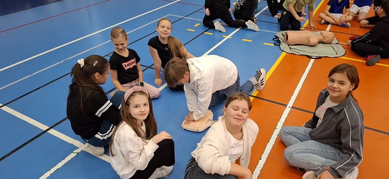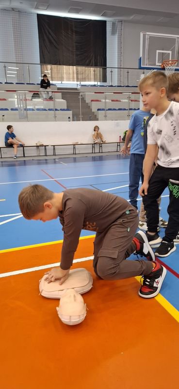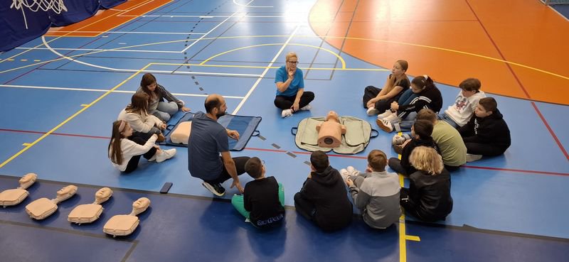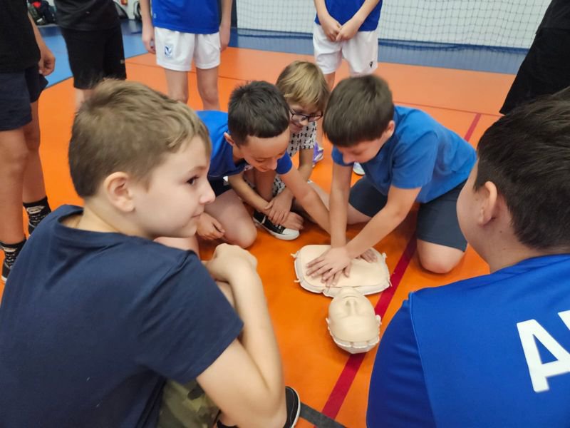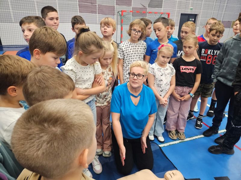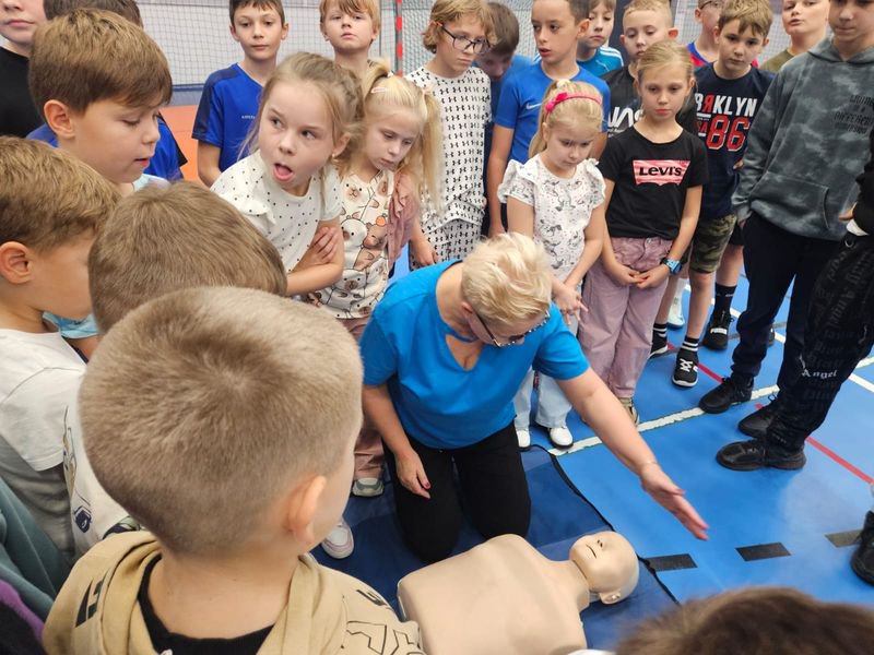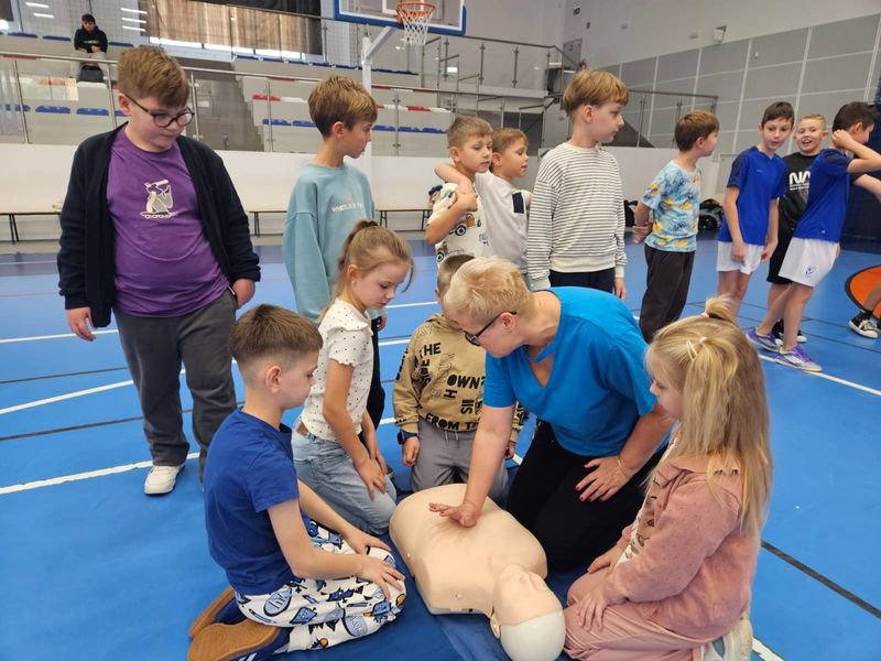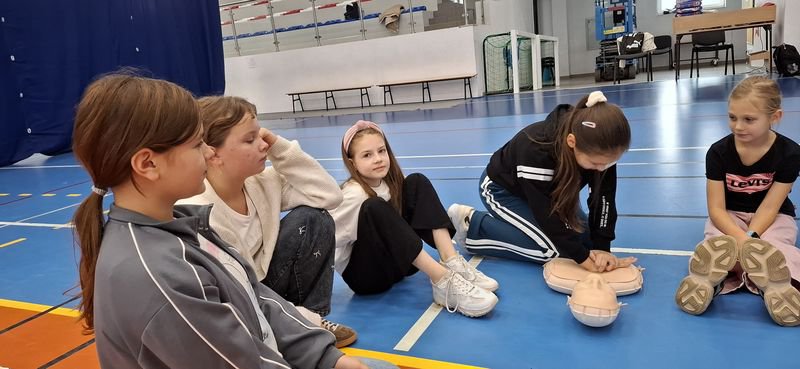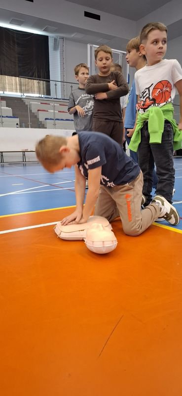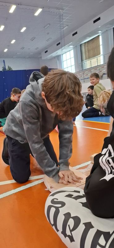 Zajęcia odbyły się w atmosferze pełnej zaangażowania i entuzjazmu. Uczniowie z wielkim zapałem uczyli się sprawdzać przytomność, wzywać pomoc oraz wykonywać uciśnięcia klatki piersiowej i oddechy ratownicze. Dzięki podziałowi na grupy i odpowiedniemu zapleczu dydaktycznemu (fantomy, materiały edukacyjne), każdy miał szansę przećwiczyć procedury RKO w praktyce.