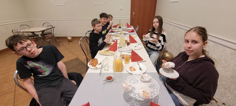 Po smacznym obiedzie nie mogło zabraknąć najważniejszego akcentu tego dnia – swojskich pączków. Ten słodki poczęstunek sprawił wszystkim wiele radości i był miłym dopełnieniem wspólnego wyjścia.