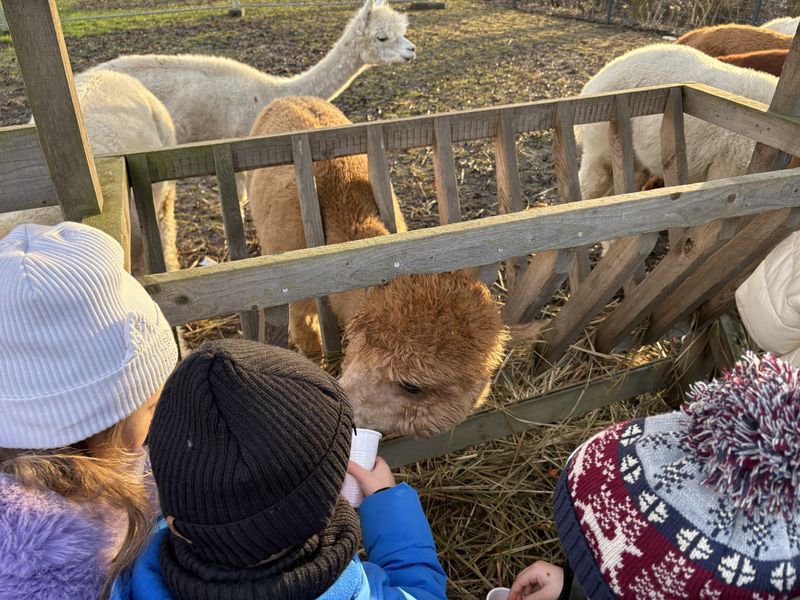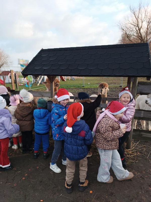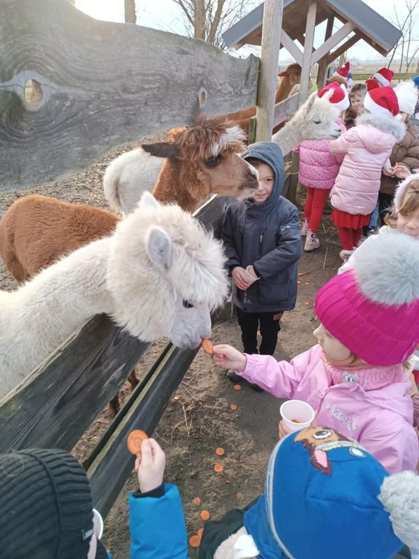 11 grudnia 2025 roku, przedszkolaki wybrały się na wyjątkową wycieczkę do Poniatówka. Celem wyprawy było spotkanie ze Świętym Mikołajem oraz poznanie sympatycznych mieszkańców gospodarstwa agroturystycznego. Musimy przyznać, że od samego rana wśród dzieci panowało wielkie podekscytowanie. Wszyscy z niecierpliwością czekali na spotkanie z Mikołajem i jego pomocnikami. W Poniatówku powitał nas właściciel gospodarstwa oraz pani animatorka, która oprowadziła wszystkich po zagrodzie. Dzieci mogły zobaczyć i pogłaskać alpaki, króliki, kózki, owce. Największą atrakcją okazało się karmienie zwierząt.