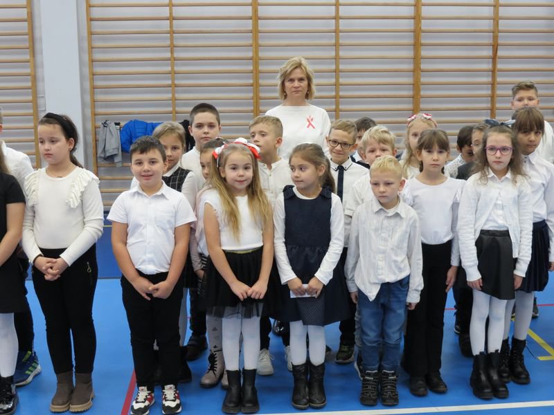 Tego dnia dla uczczenia Święta Niepodległości wszyscy zebrali się w Hali Widowiskowo-Sportowej, by wspólnie zaśpiewać nasz hymn narodowy, którego melodię zaintonował szkolny chór prowadzony przez p. Justynę Szczot oraz by wysłuchać utworów lirycznych i muzycznych w wykonaniu uczniów: Alicji Kubsik, Natalii Tomczak, Anny Szwacińskiej, Mariki Macyszyn, Huberta Napierała, Pauli Ignaczak, przygotowanych przez nauczycieli: p. Irenę Elantkowską i p. Jana Kasprzaka. Uroczystość poprowadziła Agata Przybyła.
