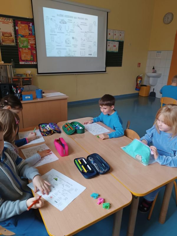 Podczas zajęć dzieci poznały najważniejsze prawa zapisane w Konwencji o Prawach Dziecka, takie jak prawo do miłości, nauki, zabawy, opieki, bezpieczeństwa czy wyrażania własnego zdania. Rozmawialiśmy o tym, jak można o siebie nawzajem dbać i jak pomagać innym.