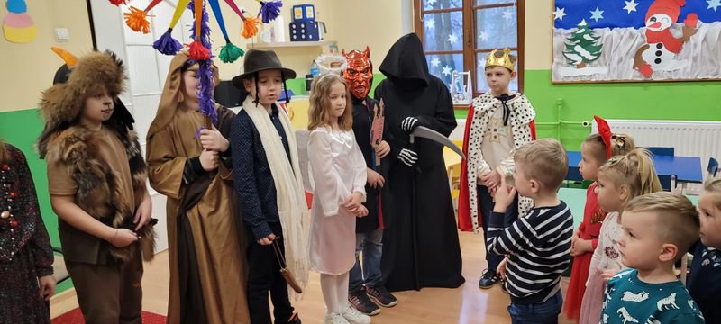 Kolędnicy, czyli Nadia Strugała (Matka Boża), Oliwia Szymańska (Anioł), Kinga Domiszewska (Cyganka), Krzysztof Frątczak (Śmierć), Fabian Gębczyński (Diabeł), Rafał Dreslerski (Żyd), Piotr Pawlus (św. Józef), Jakub Kończyński (Koza), Kacper Nowaczyk (Herod) odwiedzili wspomnianego dnia: dyrektor Ewę Kutnik, wicedyrektorów Justynę Sieczkowską i Jana Kasprzaka, burmistrza Mirosława Durczyńskiego, sekretarza/zastępcę burmistrza Annę Paszek, ks. prałata Mariana Górskiego, pracowników domu kultury i biblioteki publicznej, podopiecznych dziennego Domu Seniora+, milusińskich z „Baśniowego Dworku”, Niepublicznego Punktu Przedszkolnego „Spectrum”, Gminnego Klubu Malucha „Kącik Skrzata” oraz naszych najmłodszych. Spotkali się również z s. Imeldą Moskowicz.