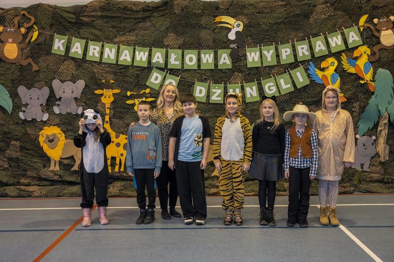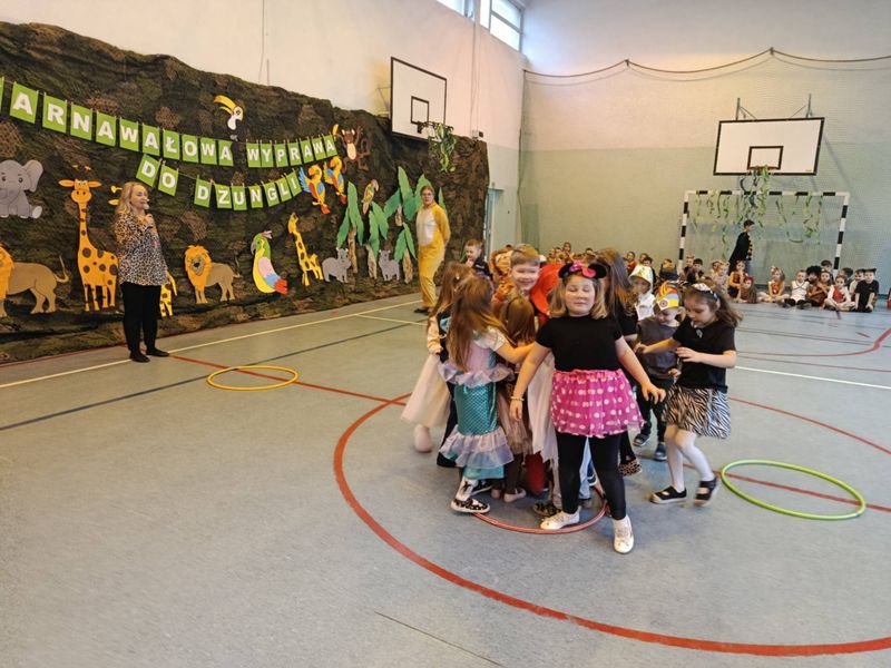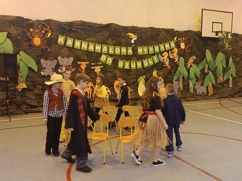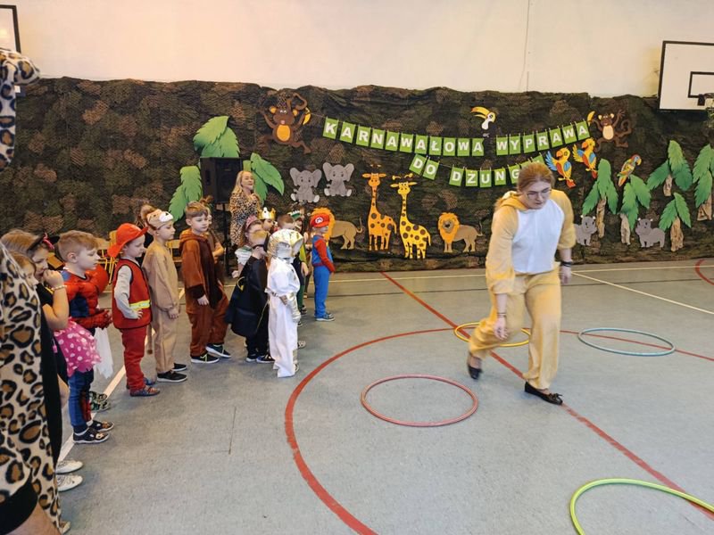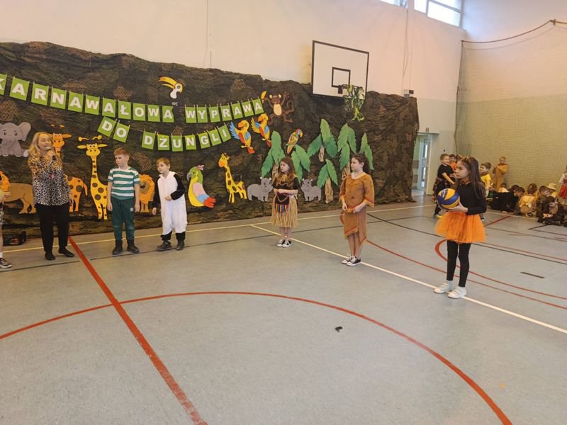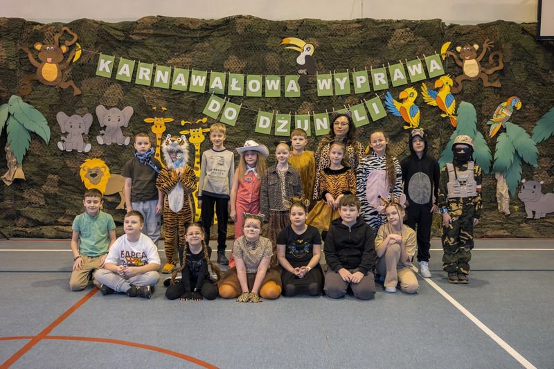 Projekt tegorocznej zabawy karnawałowej pod hasłem „Karnawałowa wyprawa do dżungli” przeniosła dzieci z oddziałów przedszkolnych oraz klas I - III w sam środek egzotycznej przygody.