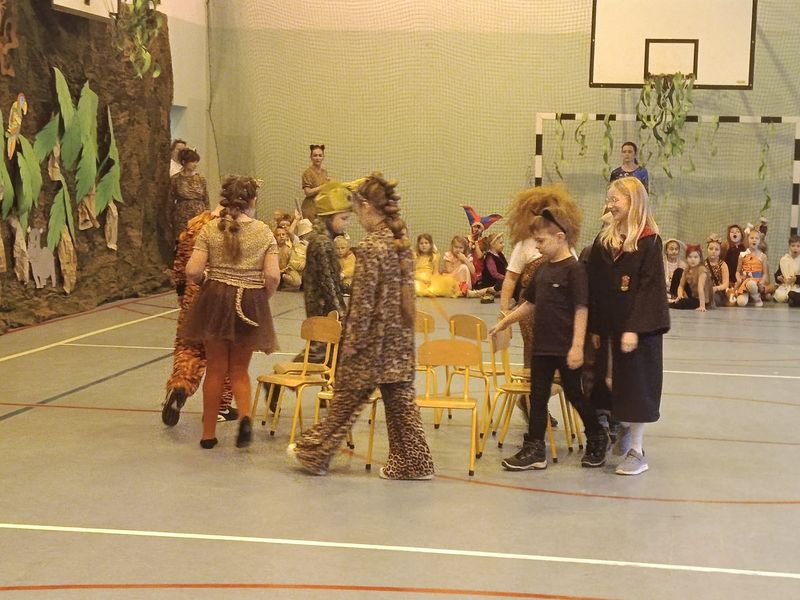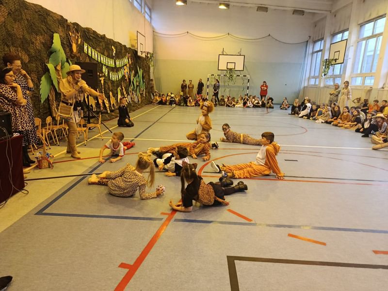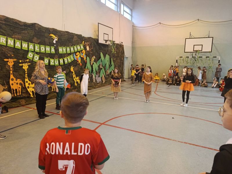 Sala gimnastyczna zamieniła się w tropikalny las pełen dzikich zwierząt, kolorowych roślin oraz zagadkowych miejsc. Dekoracje zachwycały od pierwszego wejrzenia. Było wesoło oraz aktywnie. Nad bezpieczeństwem podczas zabawy czuwali wszyscy nauczyciele organizujący imprezę.
