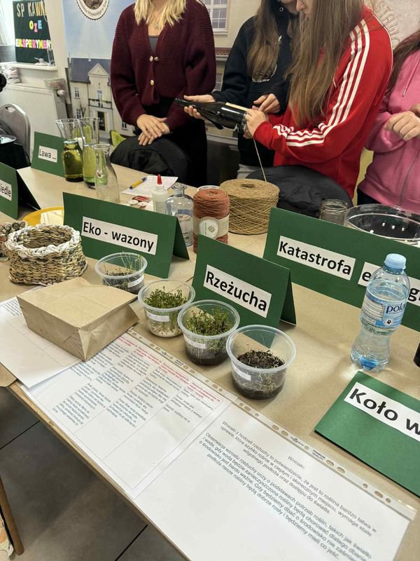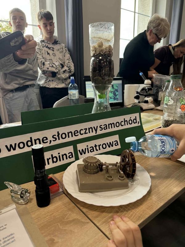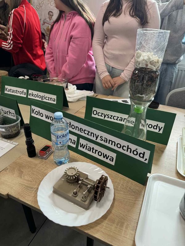 Uczniowie naszej szkoły zaprezentowali serię doświadczeń ekologicznych, które pokazywały m.in.: sposoby oczyszczania wody, działanie filtrów naturalnych, produkcję prądu, lawę, ekowazony, działanie słonecznego samochodu, turbinę wiatrową, katastrofę ekologiczną, koło wodne, a także wzrost rzeżuchy w określonych warunkach.