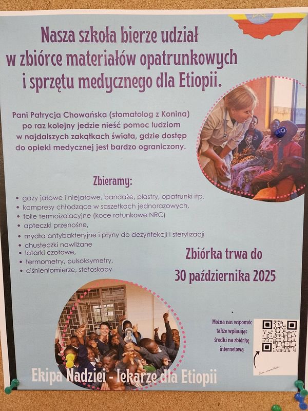 W ostatnich tygodniach społeczność Szkoły Podstawowej im. Juliusza Słowackiego w Golinie włączyła się w akcję pomocy dla szpitali i ośrodków zdrowia w Etiopii. Celem zbiórki było przekazanie materiałów i sprzętu medycznego, które wspomogą pracę tamtejszych lekarzy, i pielęgniarek oraz przyczynią się do poprawy warunków leczenia pacjentów.