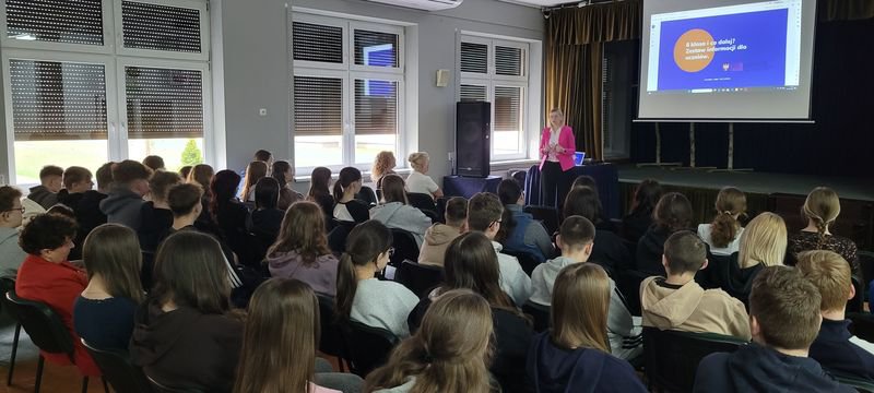„8 klasa i co dalej? Zestaw informacji dla ucznia” – to tytuł spotkania, które odbyło się 13 kwietnia 2026 r. z myślą o najstarszym roczniku młodzieży z naszej szkoły. Poprowadziła je Anna Koziarska - główny specjalista ds. doradztwa zawodowego w Centrum Kształcenia Rzemiosła Dualnego i Zawodowego w Koninie.