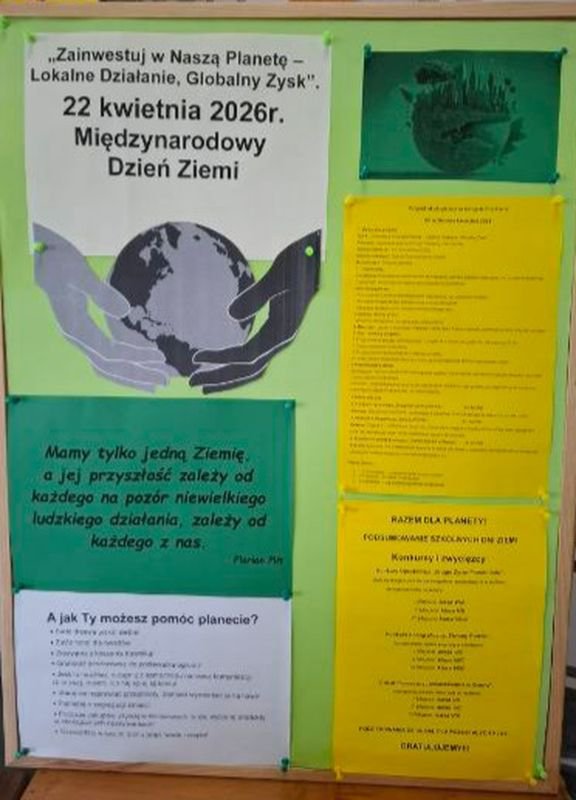 W dniach 13 - 22 kwietnia 2026 r. społeczność naszej szkoły obchodziła Światowy Dzień Ziemi. Pod hasłem „Zainwestuj w Naszą Planetę – Lokalne Działanie, Globalny Zysk” zrealizowaliśmy szereg działań proekologicznych, mających na celu podniesienie świadomości ekologicznej uczniów oraz kształtowanie postaw szacunku do przyrody. Projekt zaangażował uczniów klas IV-VIII, a jego kulminacją było rozstrzygnięcie konkursów ekologicznych.