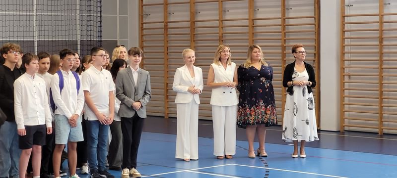Po wszystkim pani dyrektor Ewa Kutnik wraz z przedstawicielem Samorządu Uczniowskiego Adamem Rubasem dokonali uroczystego przecięcia wstęgi inaugurującego rok szkolny 2024/2025.