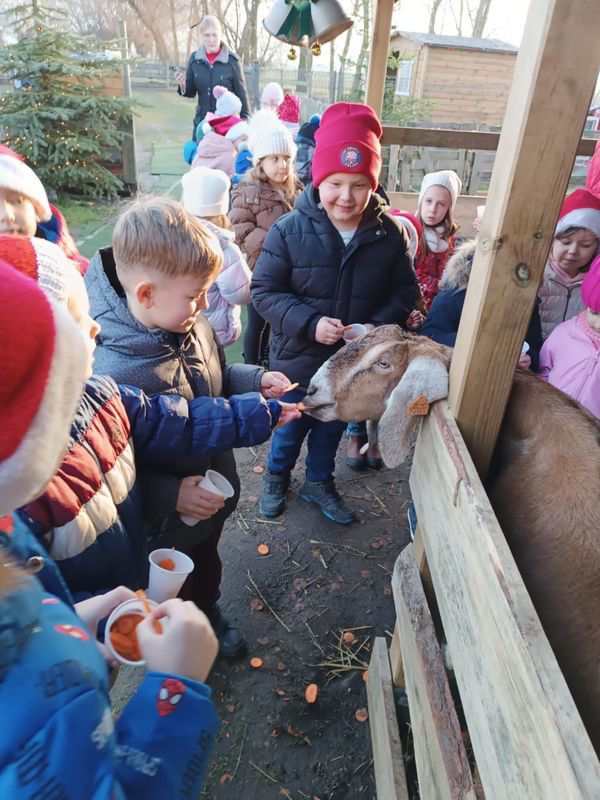 11 grudnia 2025 roku, przedszkolaki wybrały się na wyjątkową wycieczkę do Poniatówka. Celem wyprawy było spotkanie ze Świętym Mikołajem oraz poznanie sympatycznych mieszkańców gospodarstwa agroturystycznego. Musimy przyznać, że od samego rana wśród dzieci panowało wielkie podekscytowanie. Wszyscy z niecierpliwością czekali na spotkanie z Mikołajem i jego pomocnikami. W Poniatówku powitał nas właściciel gospodarstwa oraz pani animatorka, która oprowadziła wszystkich po zagrodzie. Dzieci mogły zobaczyć i pogłaskać alpaki, króliki, kózki, owce. Największą atrakcją okazało się karmienie zwierząt.